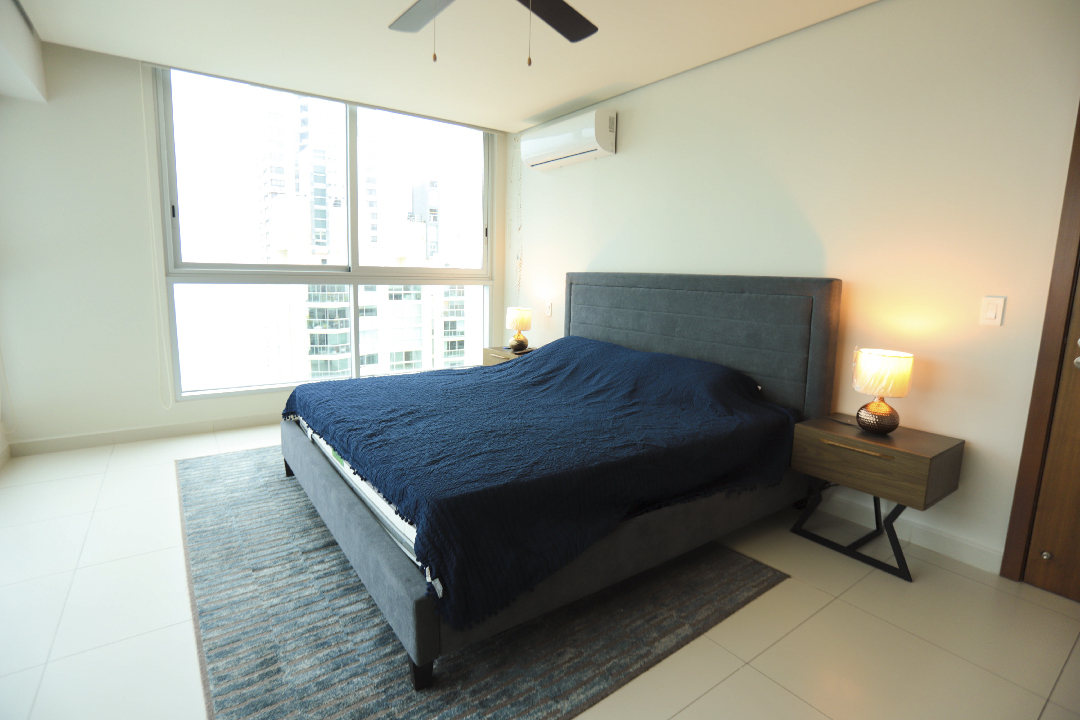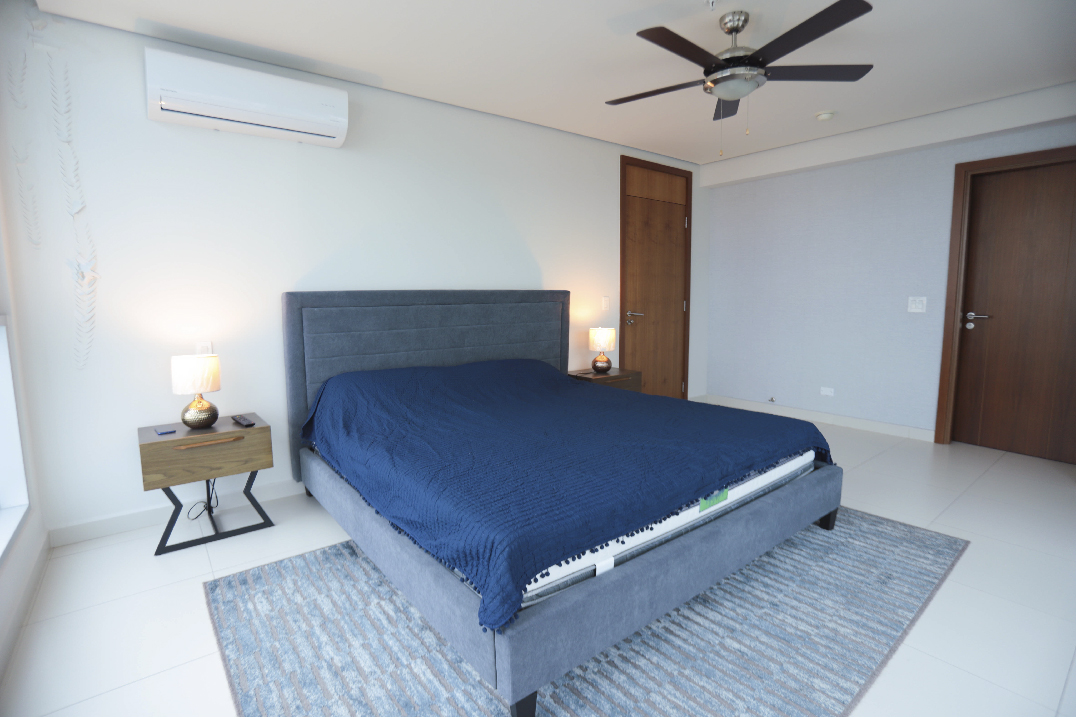 El apartamento incluye 2 aires acondicionados tipo split, 1 estacionamiento privado (Nivel 100, E-1 No. 25) y una cuota de mantenimiento de $178.50 que brinda acceso a todas las amenidades del edificio.